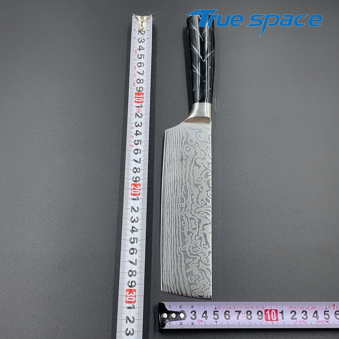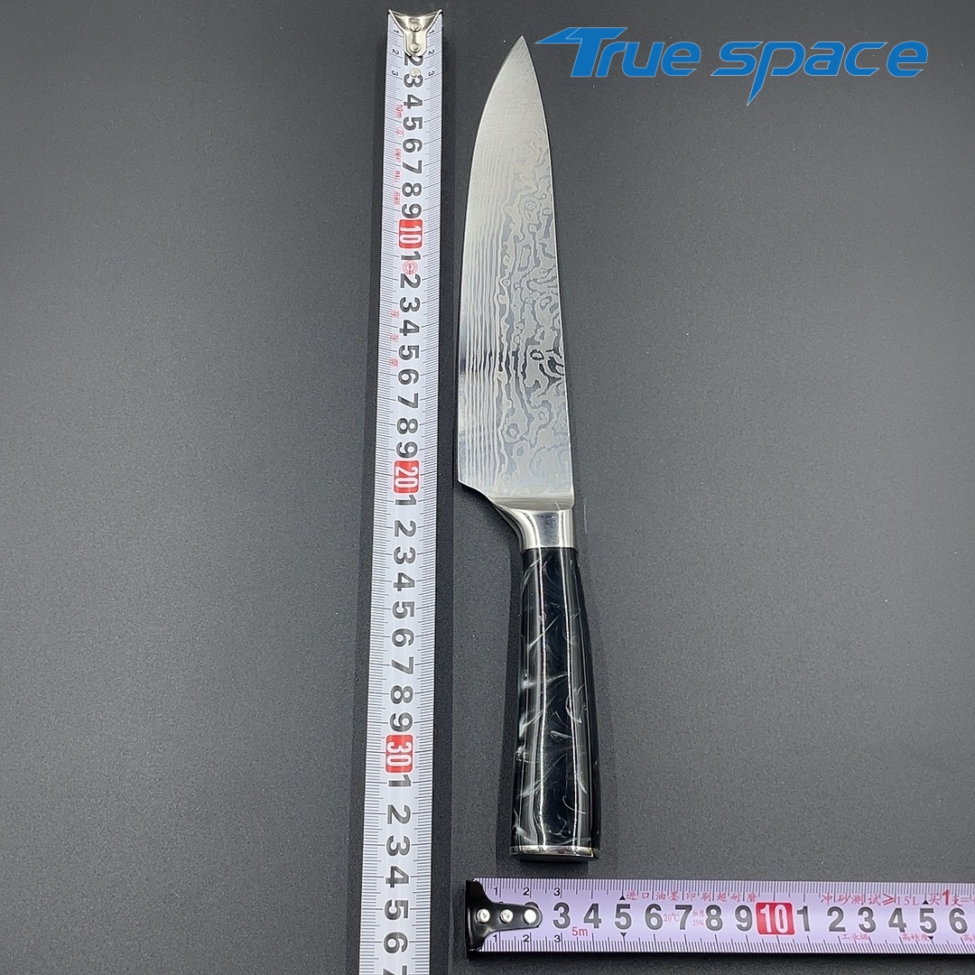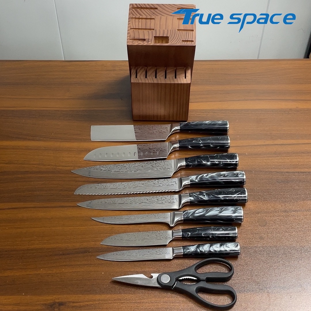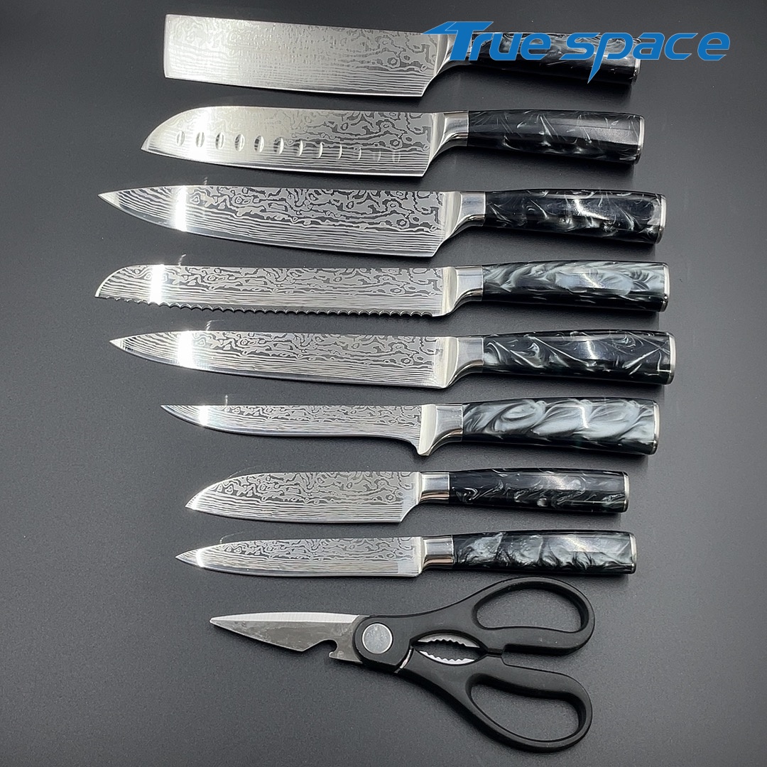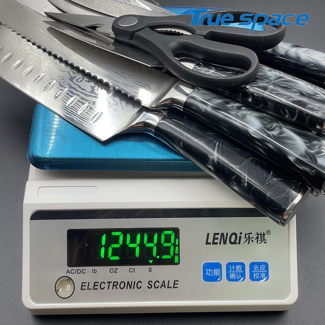 MaterialBlade Material: Damascus SteelHandle Material: ResinOptions9-piece Damascus knife set with a knife block(带刀架的大马士革套刀9件)Measurement/Weight3209.8g