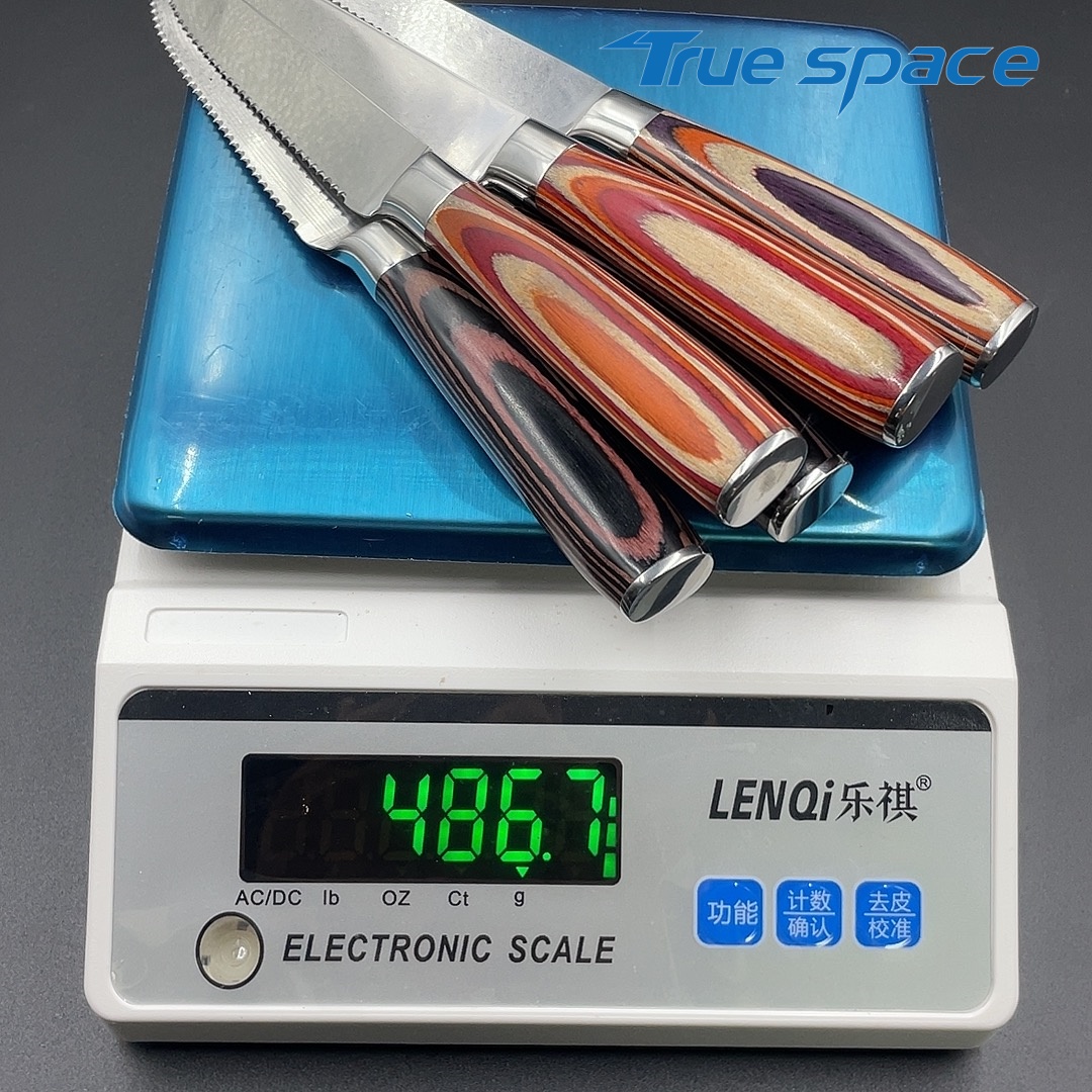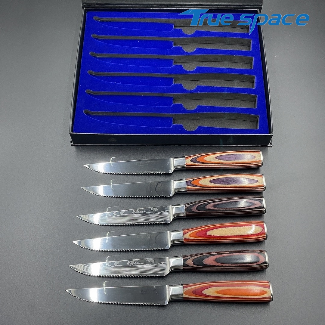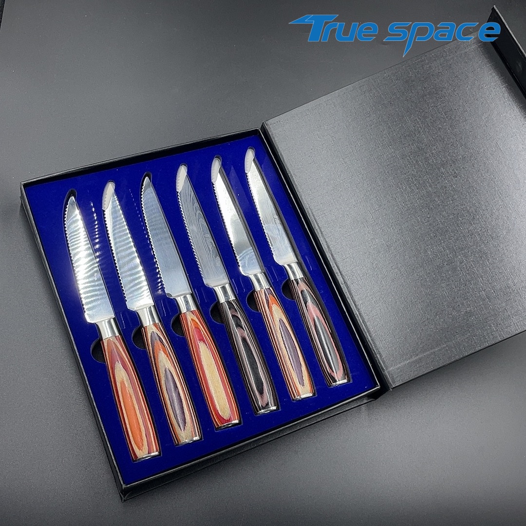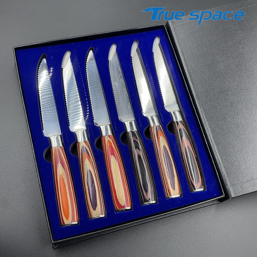 Material Blade Material: Damascus Steel Handle Material: Colored Wood Options 6-piece steak knife set with gift box(带礼盒的6件牛排刀) Measurement 21.6*2.1cm Weight 784.3g
