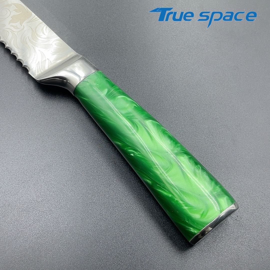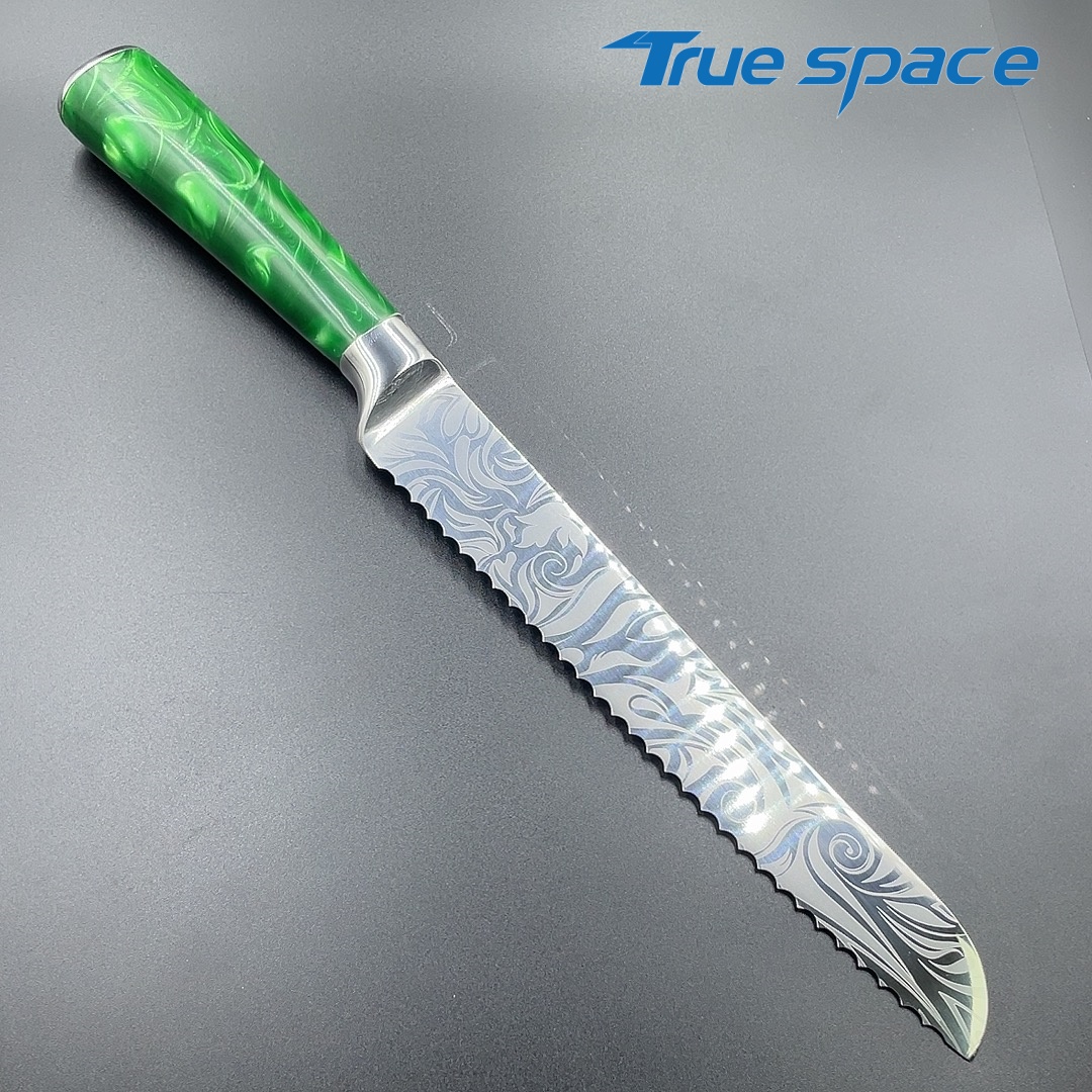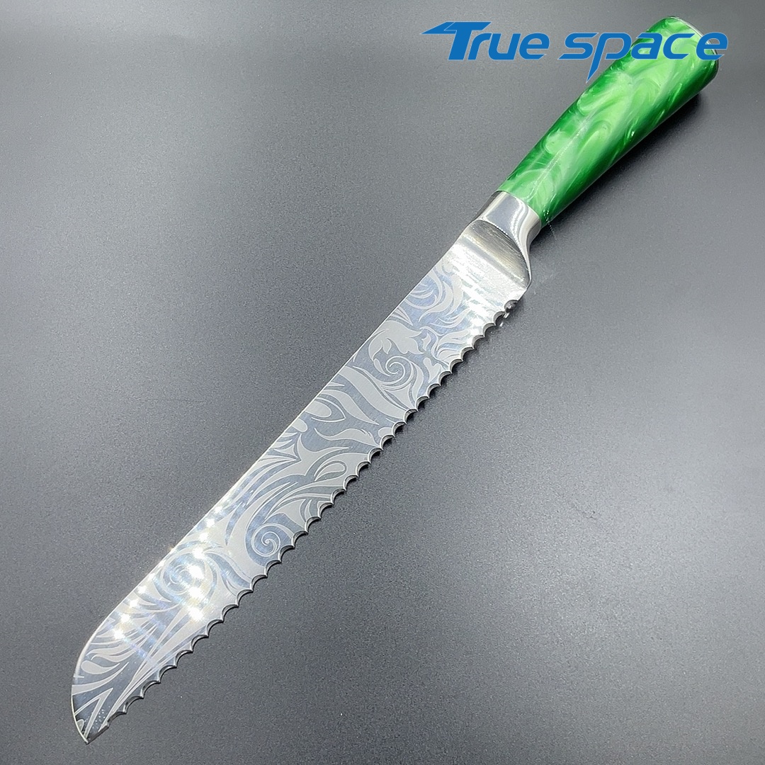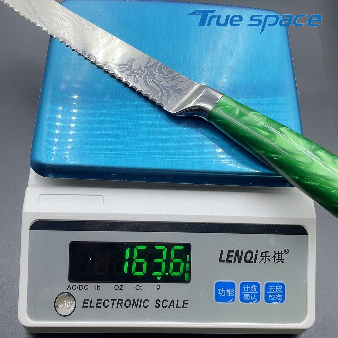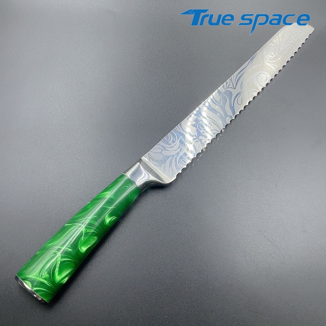 MaterialDamascus SteelOptions1、Bread knife2、Bread knife with gift boxMeasurement32.7*3cmWeightKnife only: 163.6gWith gift box: 284.6g
