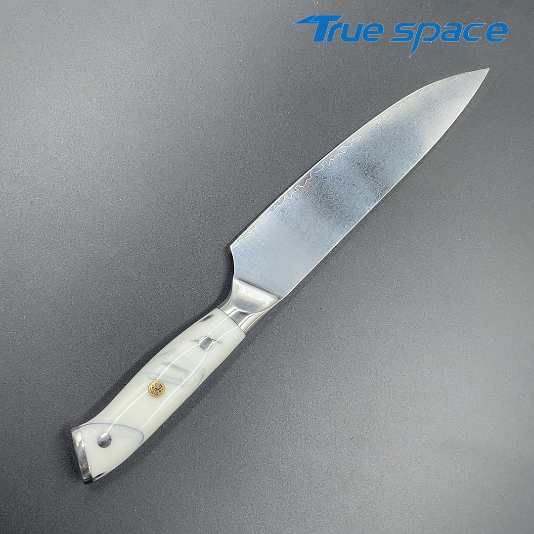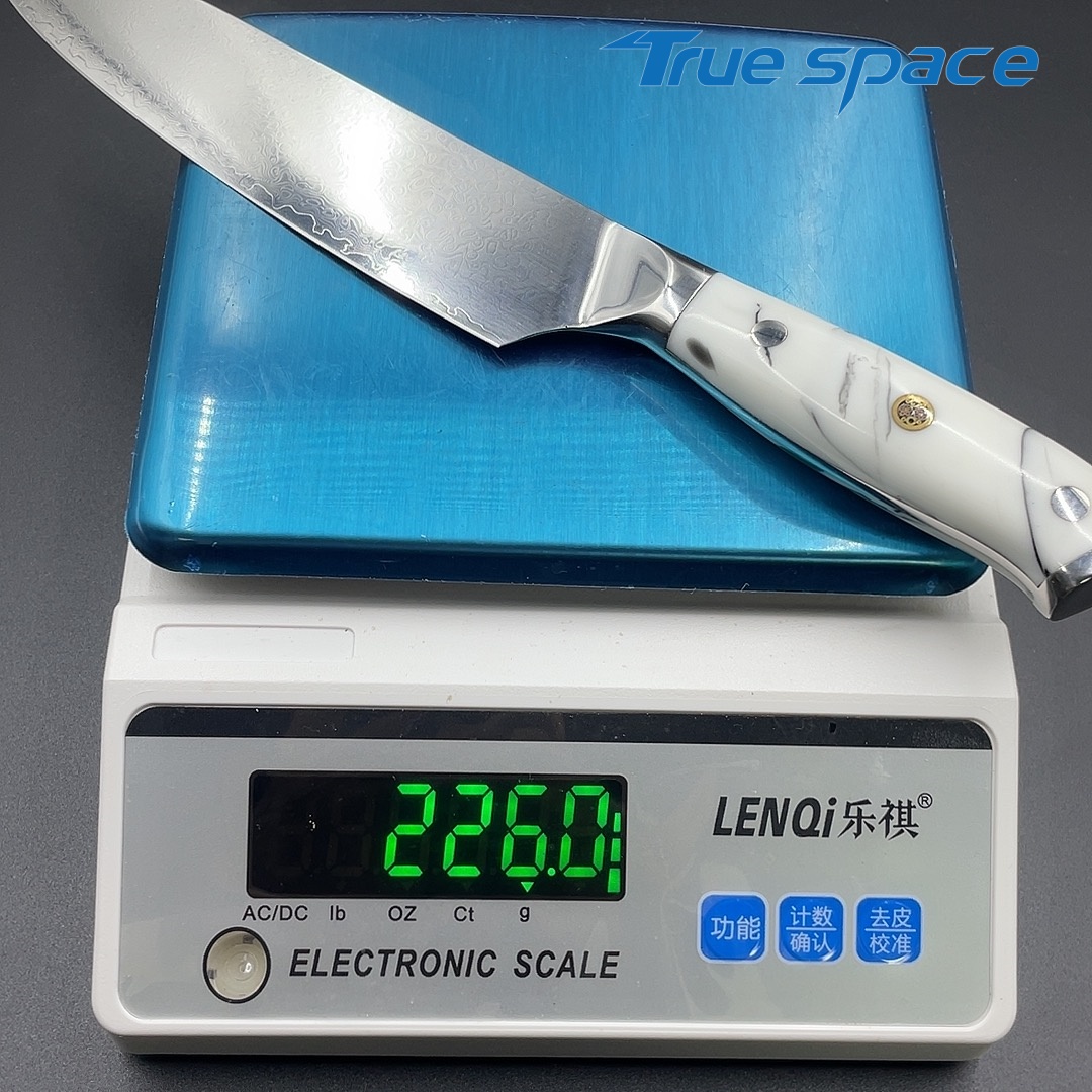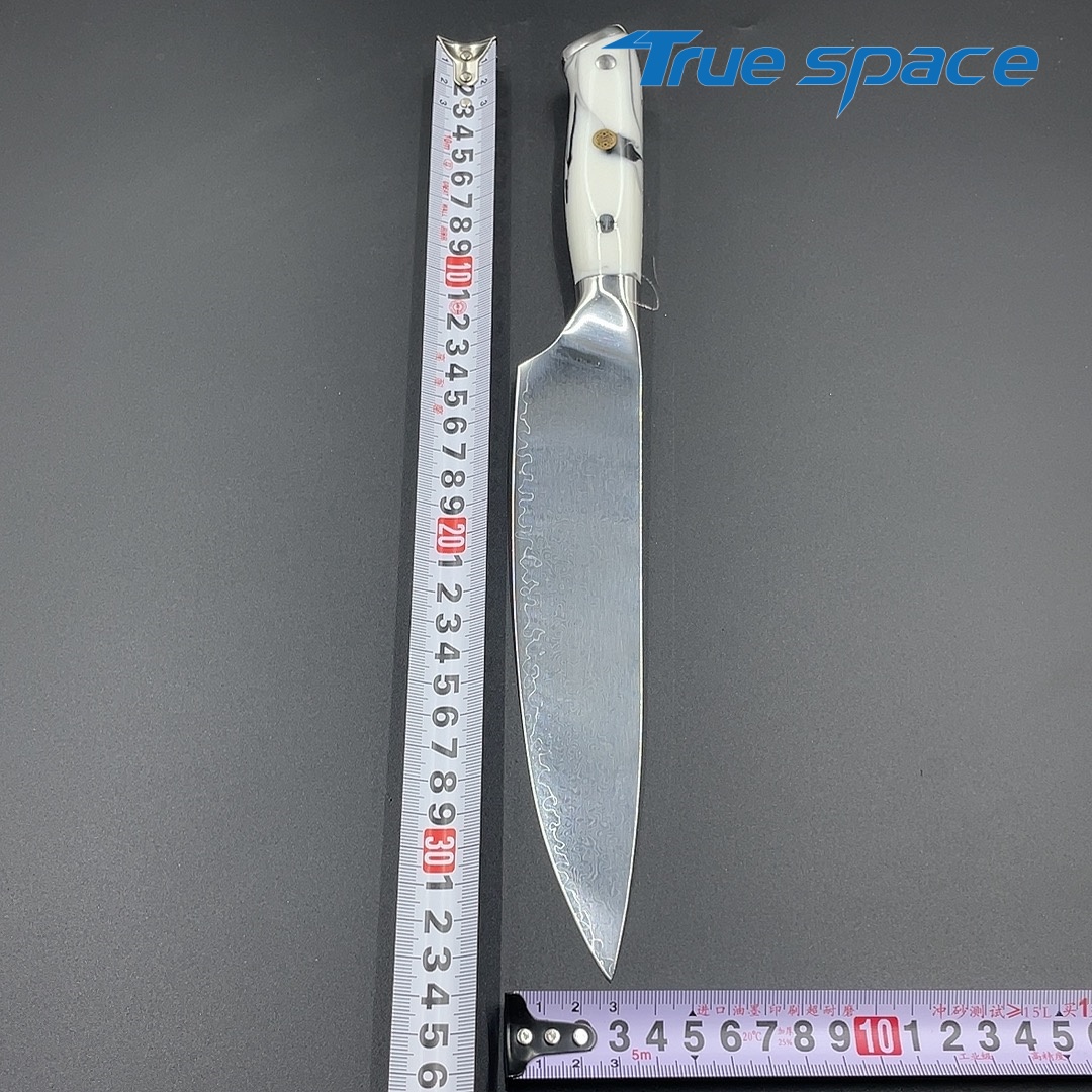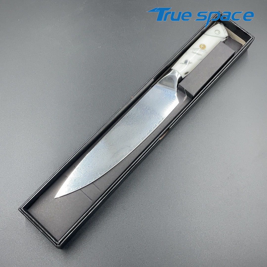 MaterialDamascus SteelOptions1、Chef knife2、Chef knife with gift boxMeasurement33.6*4.2cmWeightKnife only: 226gWith gift box: 346.6g