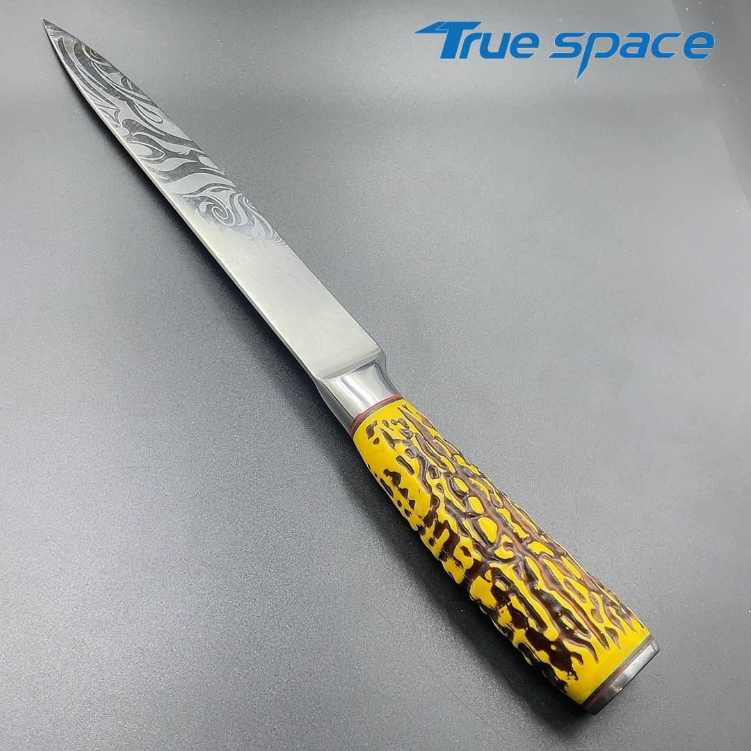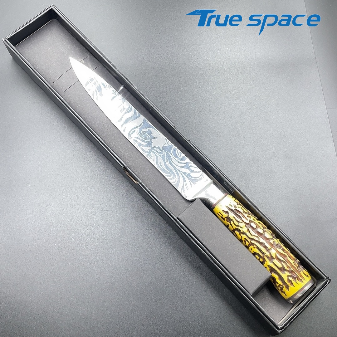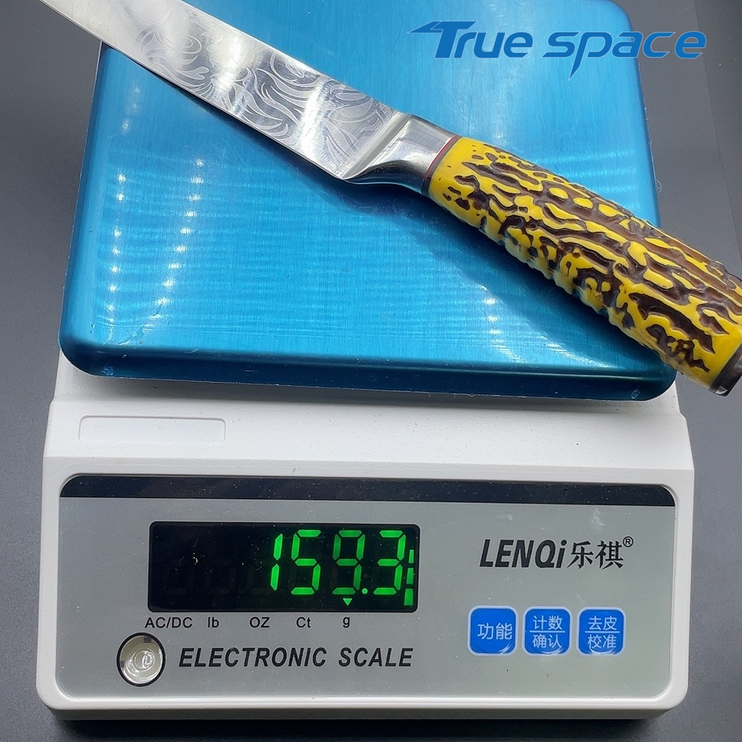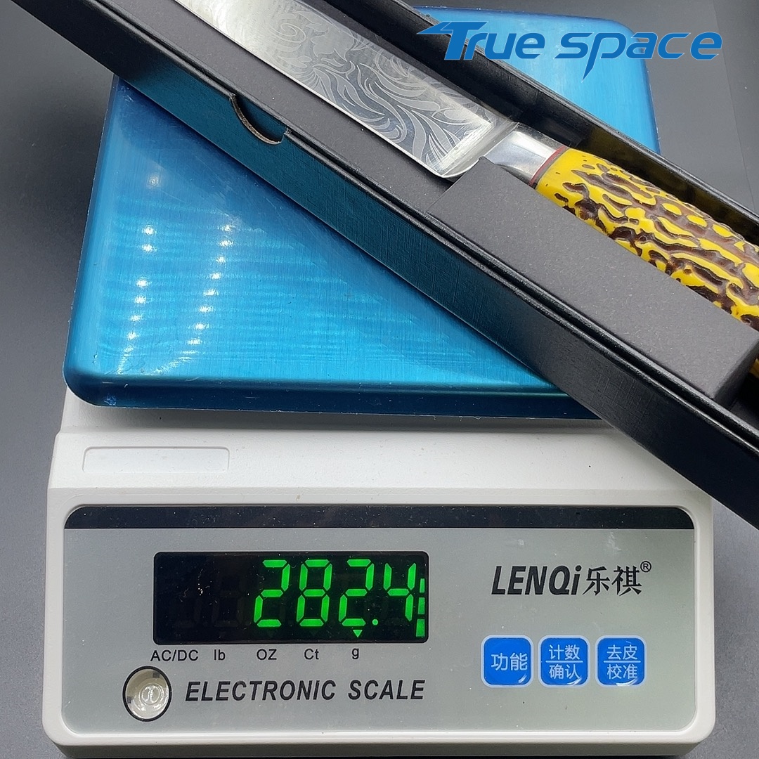 MaterialDamascus SteelOptions1、Slicing knife2、Slicing knife with gift boxMeasurement31.3*3cmWeightKnife only: 159.3gWith gift box: 282.4g