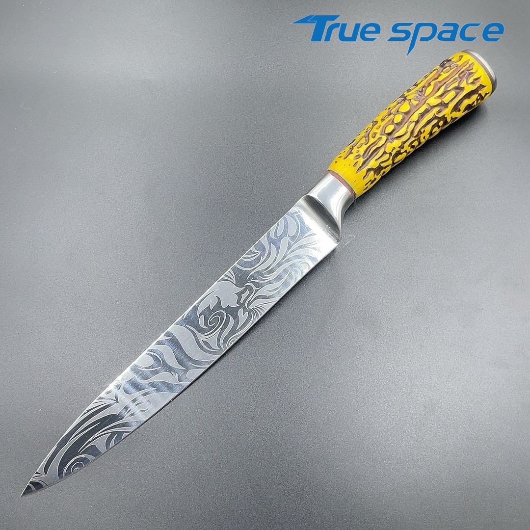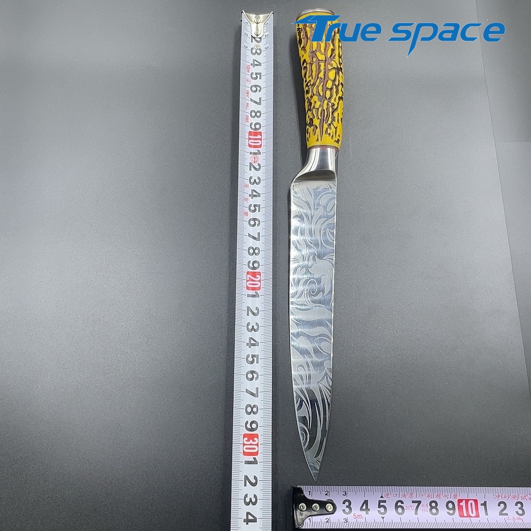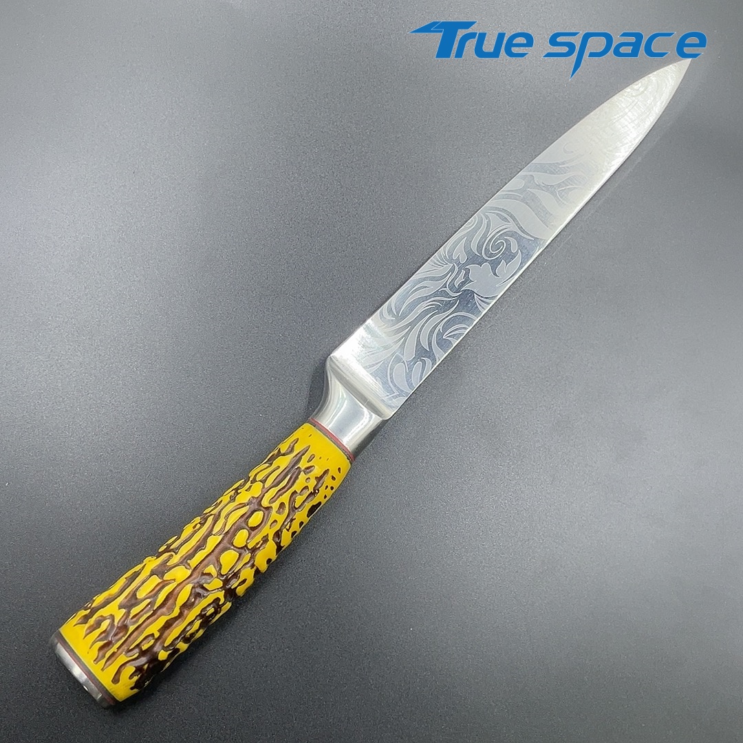 MaterialDamascus SteelOptions1、Slicing knife2、Slicing knife with gift boxMeasurement31.3*3cmWeightKnife only: 159.3gWith gift box: 282.4g