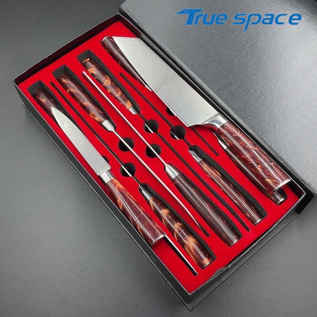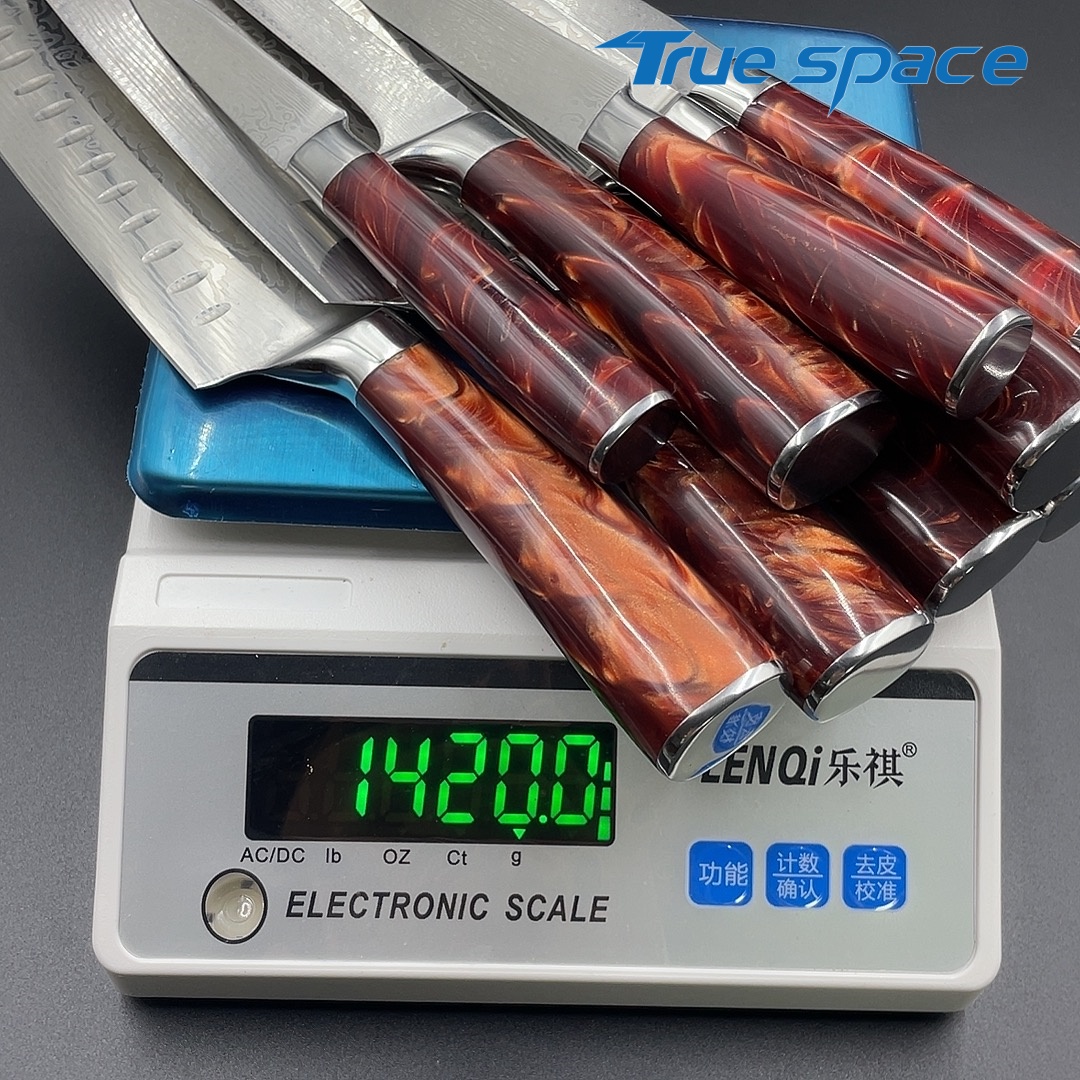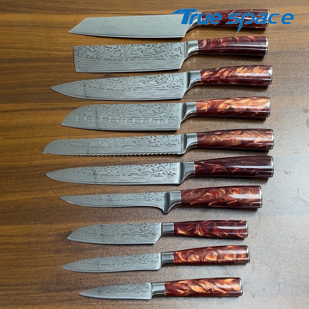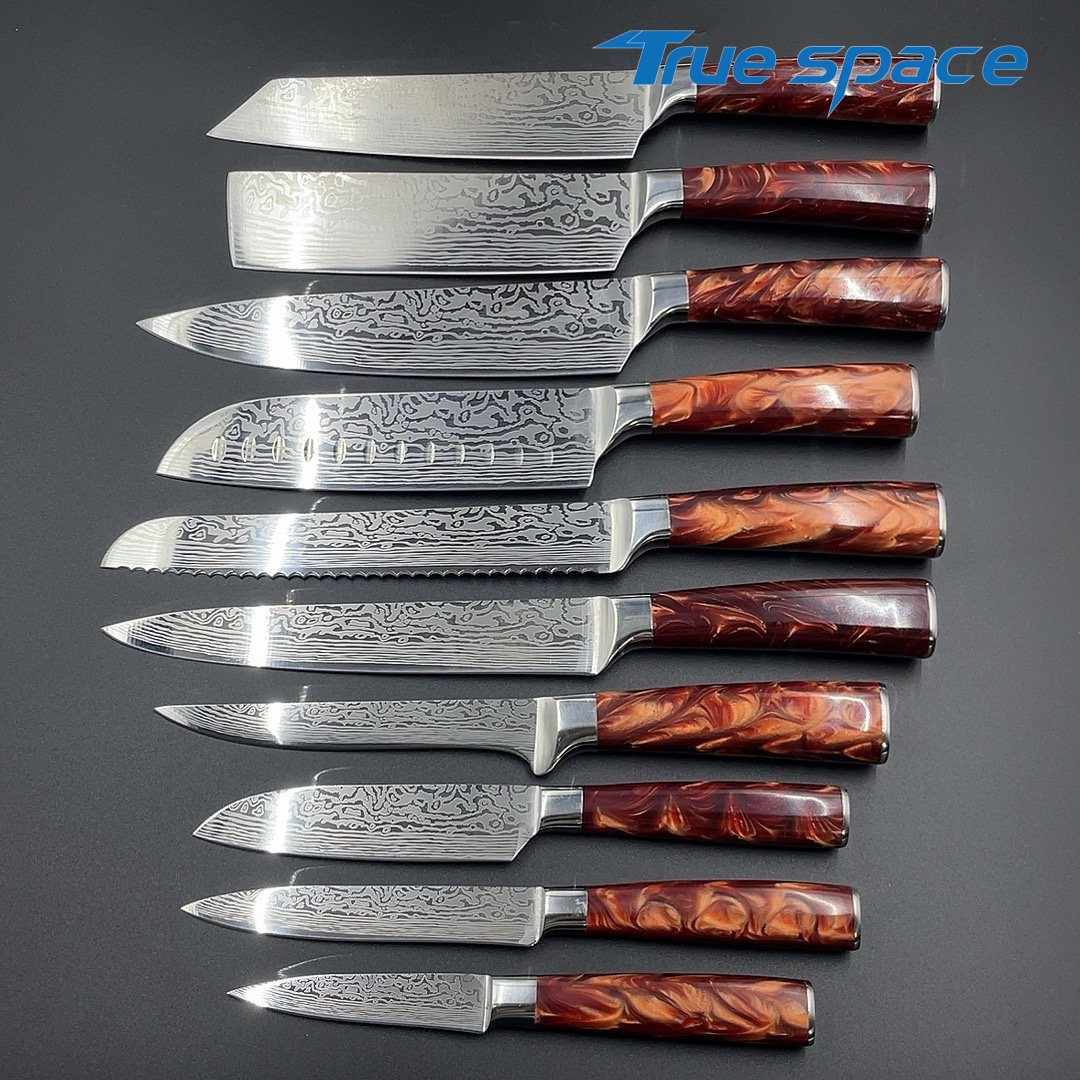 Material Blade Material: Damascus Steel Handle Material: Resin Options 10-piece Damascus knife set with gift box(带礼盒的大马士革套刀10件) Measurement 37.5*18.7*6.5cm Weight 1945.7g