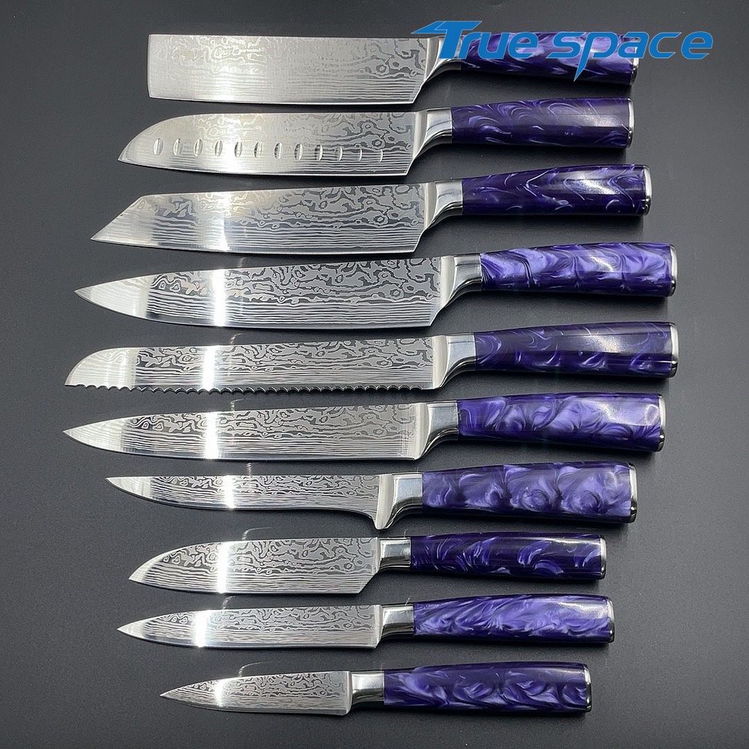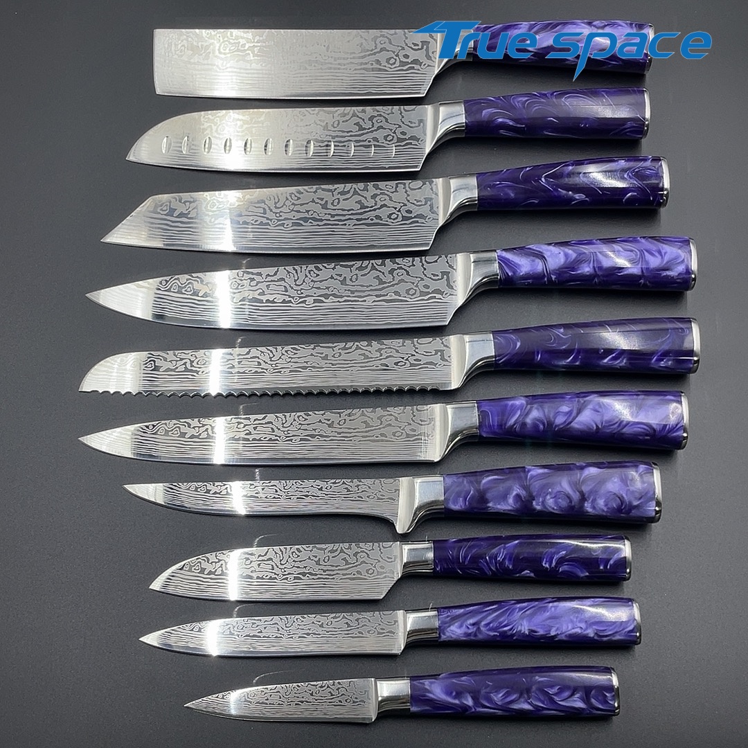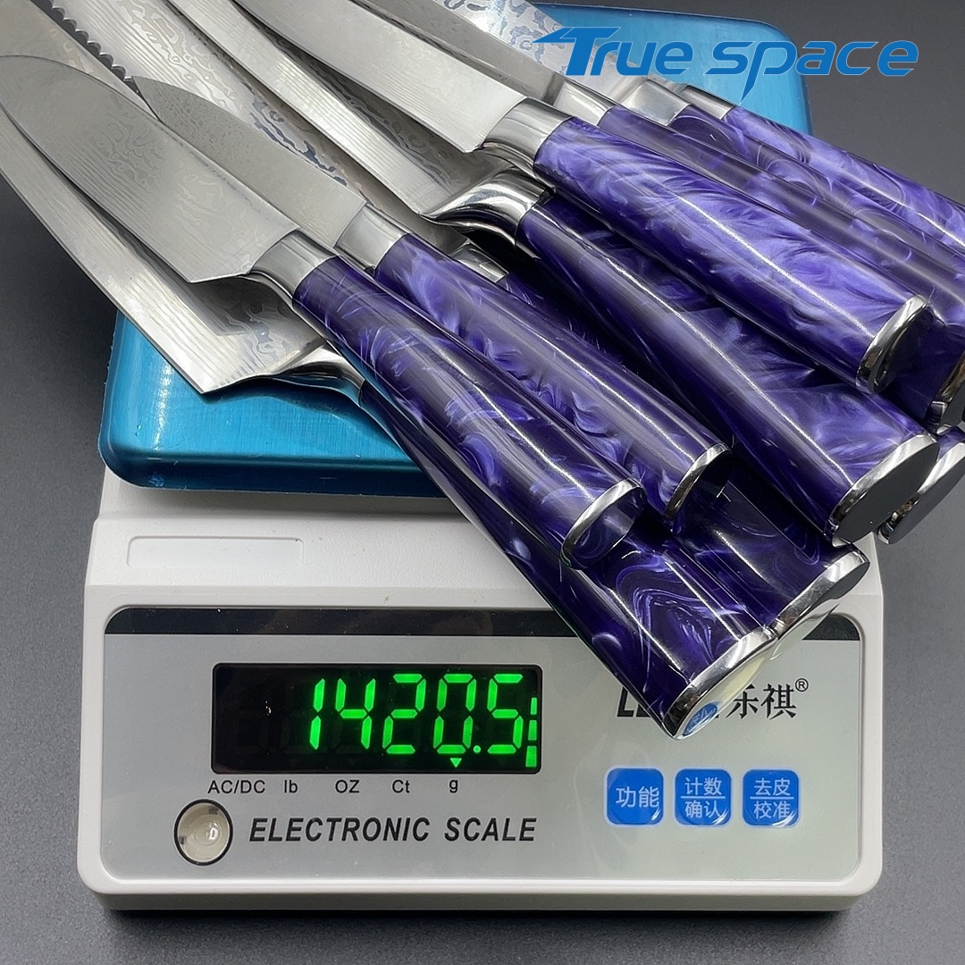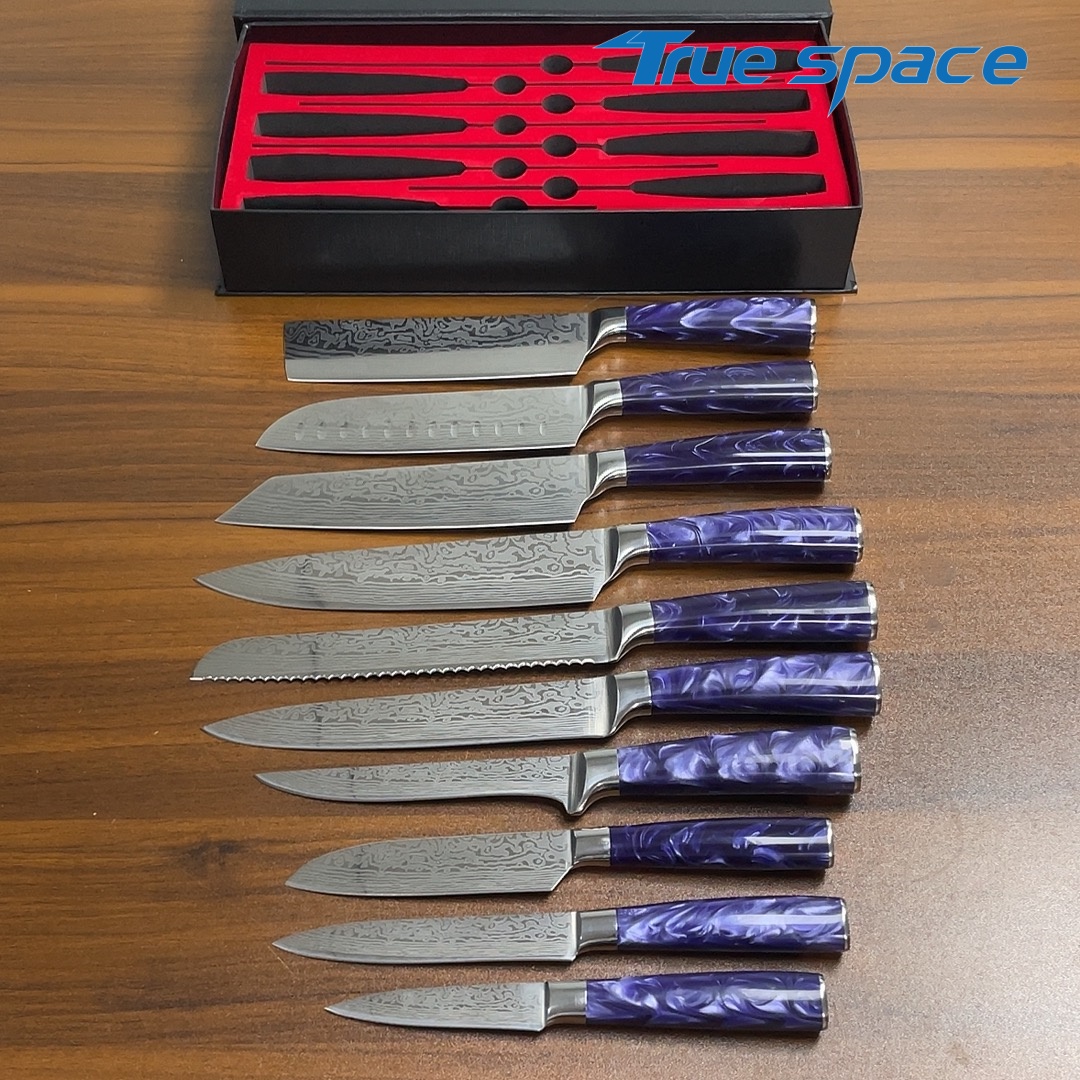 Material Blade Material: Damascus Steel Handle Material: Resin Options 10-piece Damascus knife set with gift box(带礼盒的大马士革套刀10件) Measurement 37.5*18.7*6.5cm Weight 1946.7g