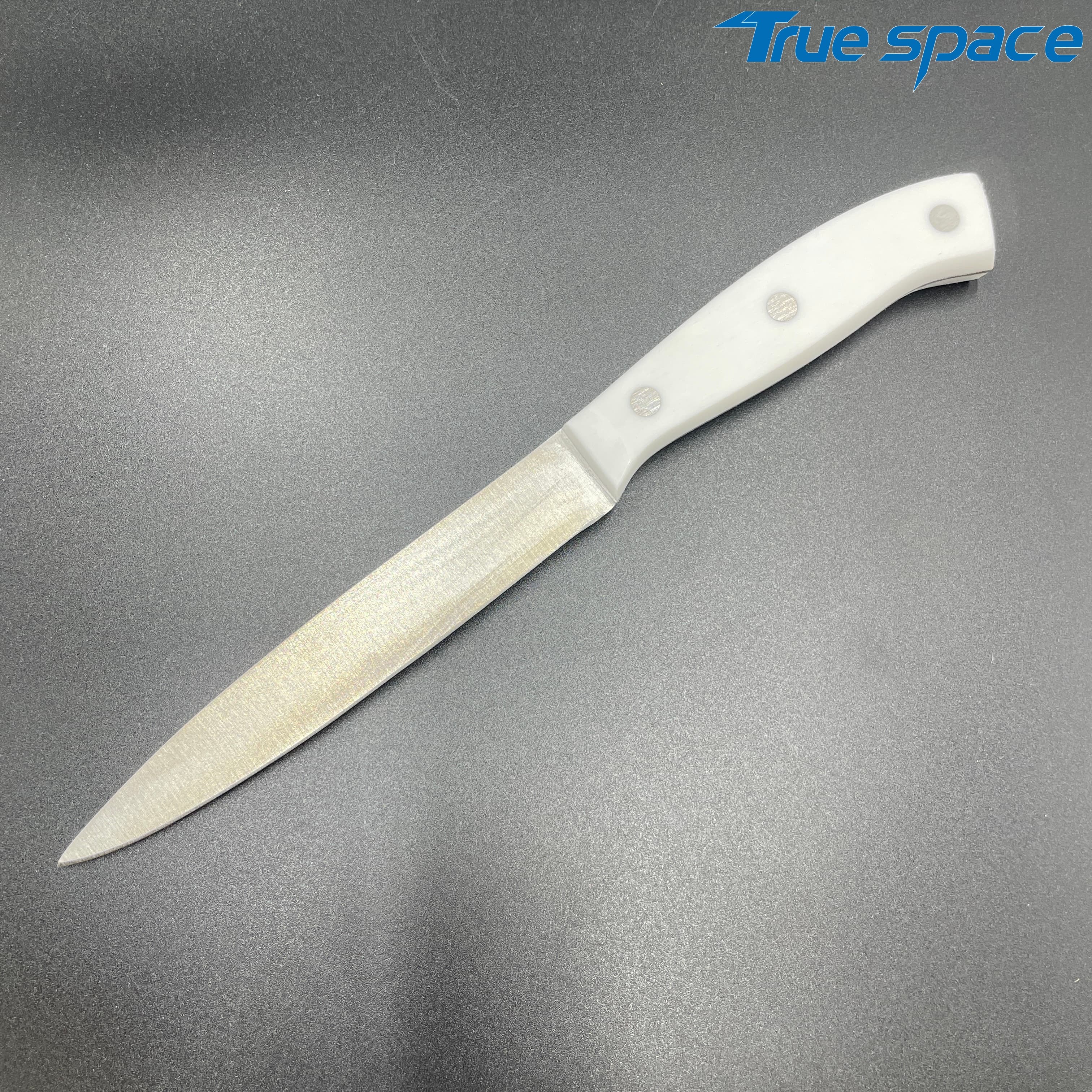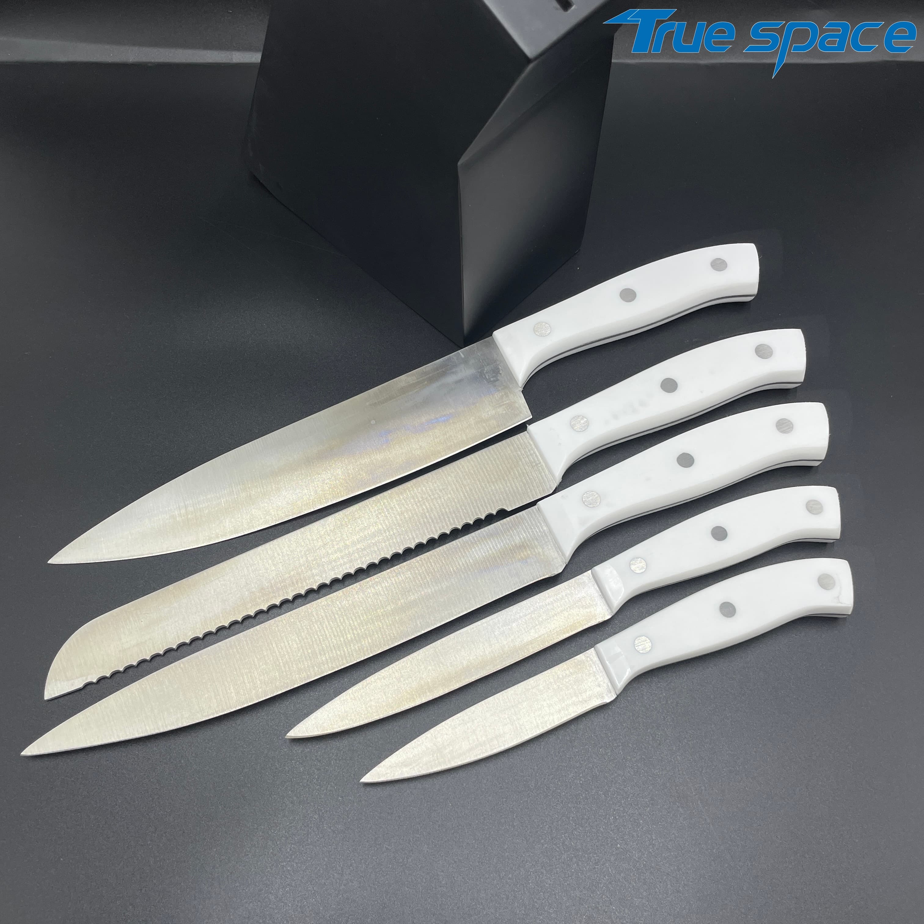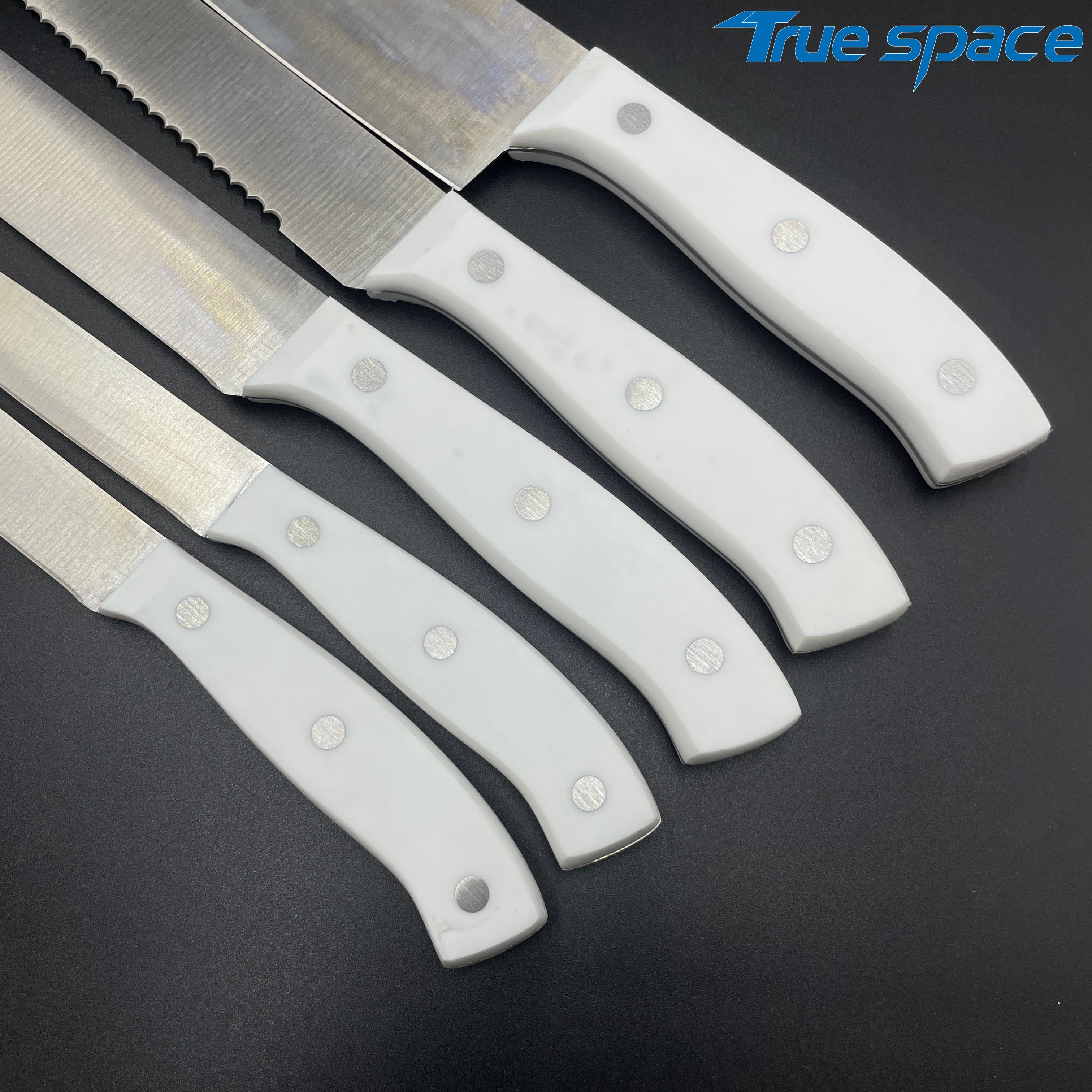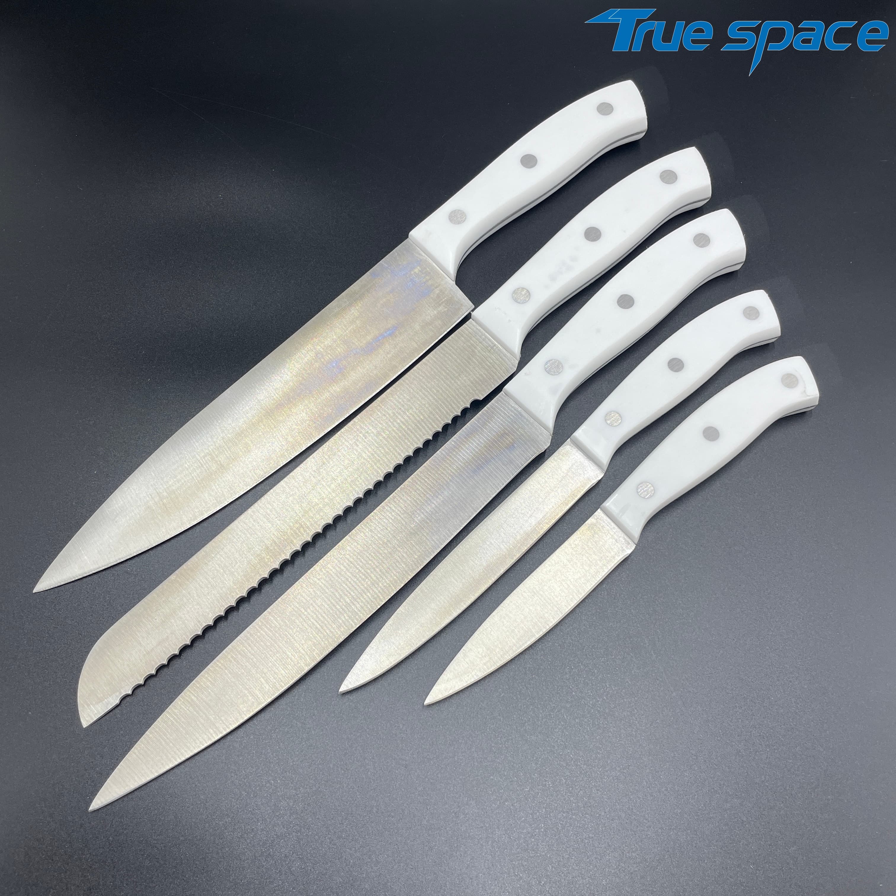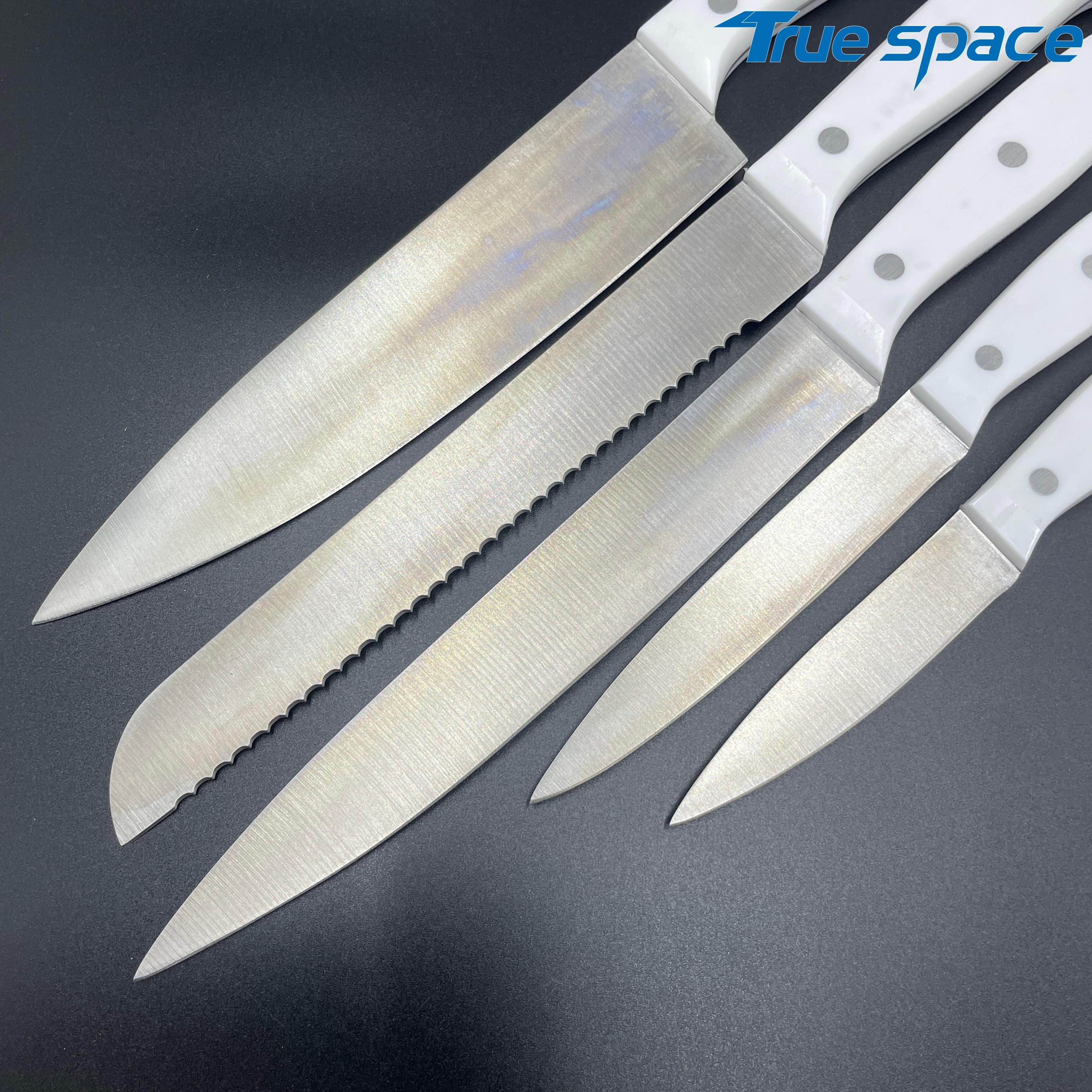 MeasurementFruit knife: 19.8 * 1.8 cmMulti-functional knife: 20 * 1.9 cmSlicing knife: 33 * 2.8 cmToothed knife: 33 * 2.7 cmChef’s knife: 32.2 * 4.2 cmMaterialBlade: Stainless steelHandle:PlasticWeight415.3gOptions/