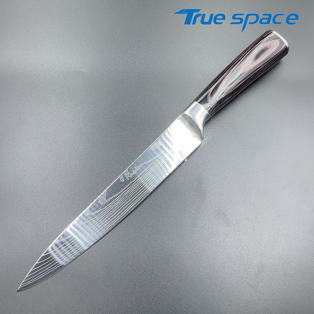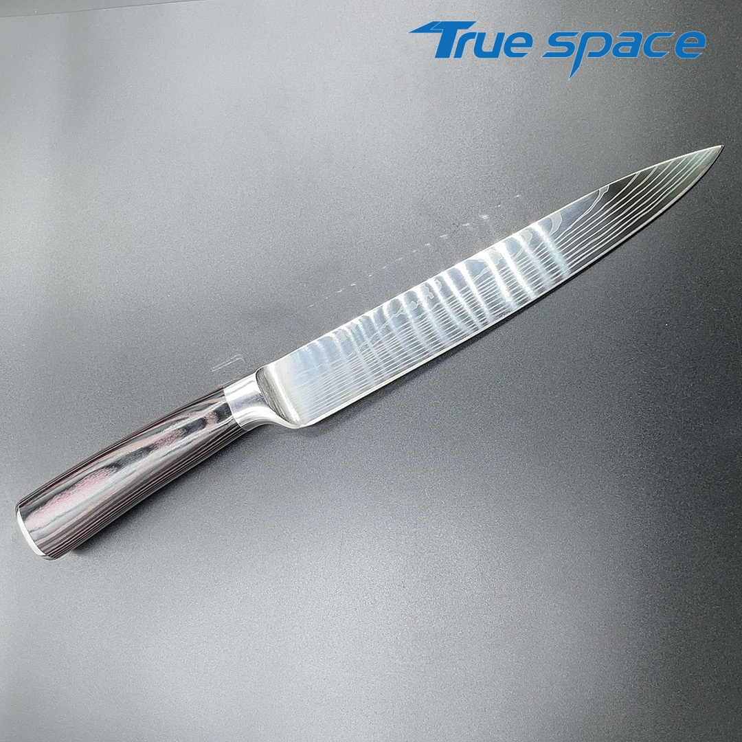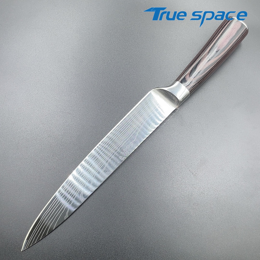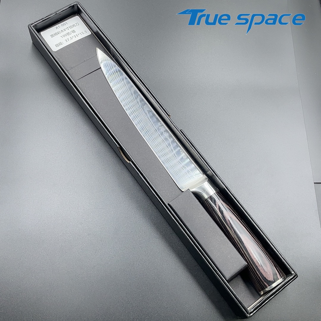 MaterialDamascus SteelOptions1、Slicing knife2、Slicing knife with gift boxMeasurement31.7*3cmWeightKnife only: 154.5gWith gift box: 275.6g