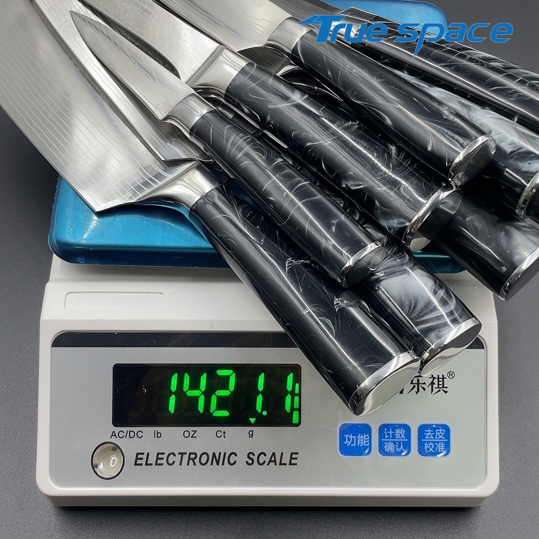 Material Blade Material: Damascus Steel Handle Material: Resin Options 10-piece Damascus knife set with gift box(带礼盒的大马士革套刀10件) Measurement 37.5*18.7*6.5cm Weight 1945g