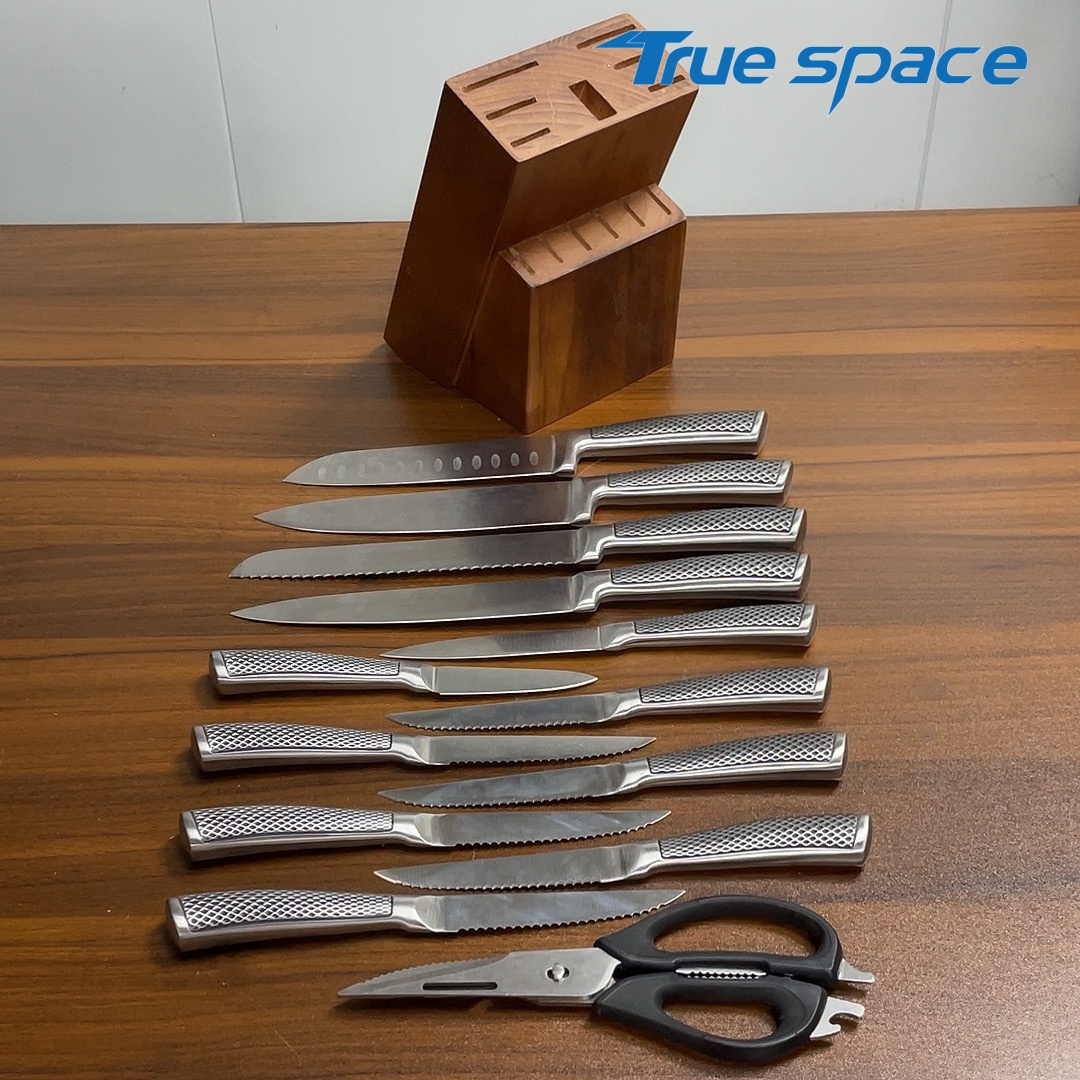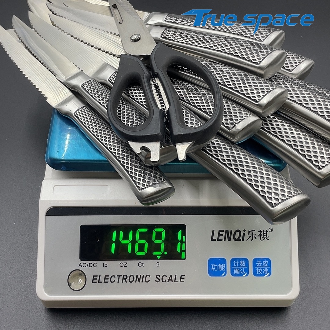 MaterialBlade Material: Stainless SteelHandle Material: Stainless SteelOptionsKitchen knife 13-piece set with a knife block(带刀架的厨房刀13件套)Measurement/Weight3015g