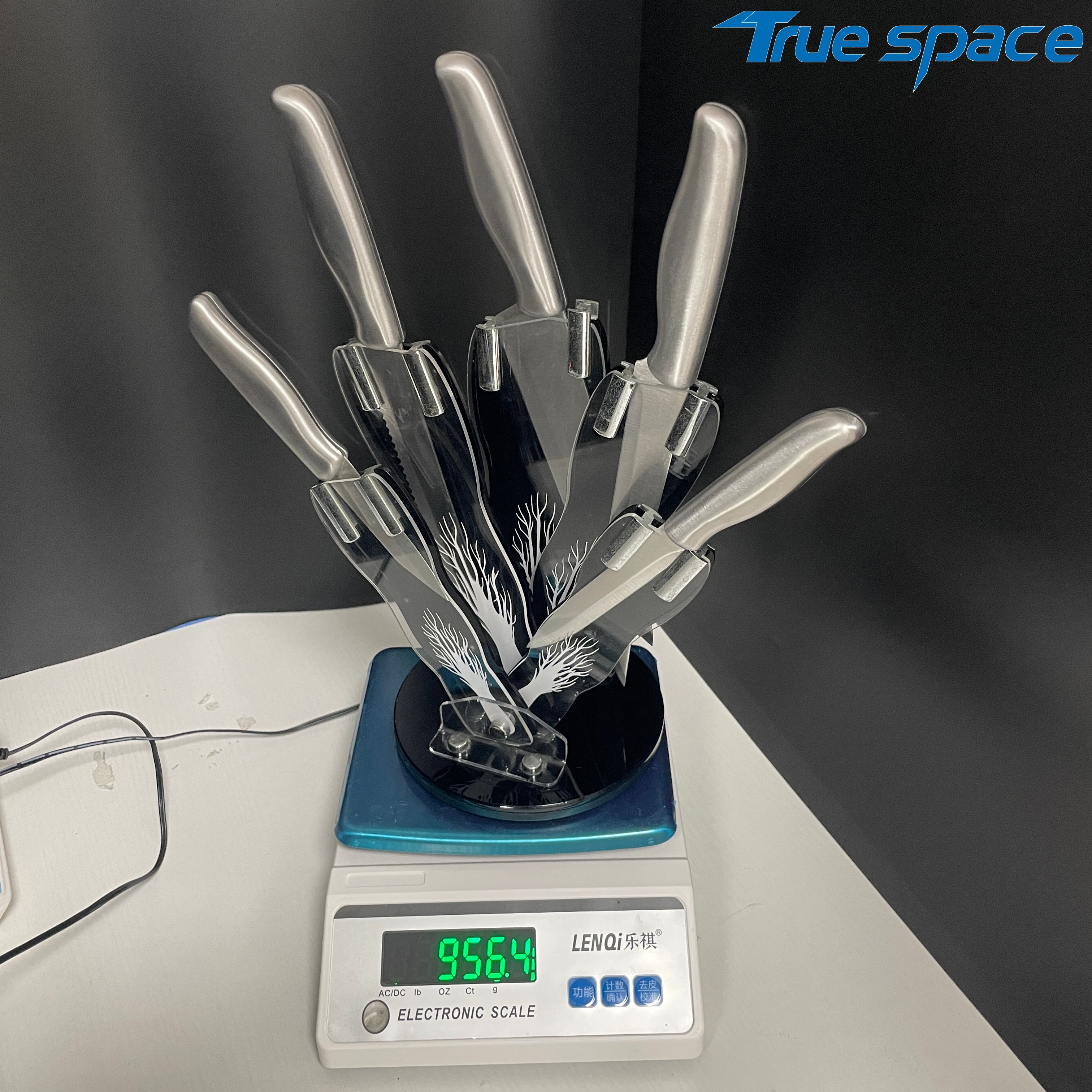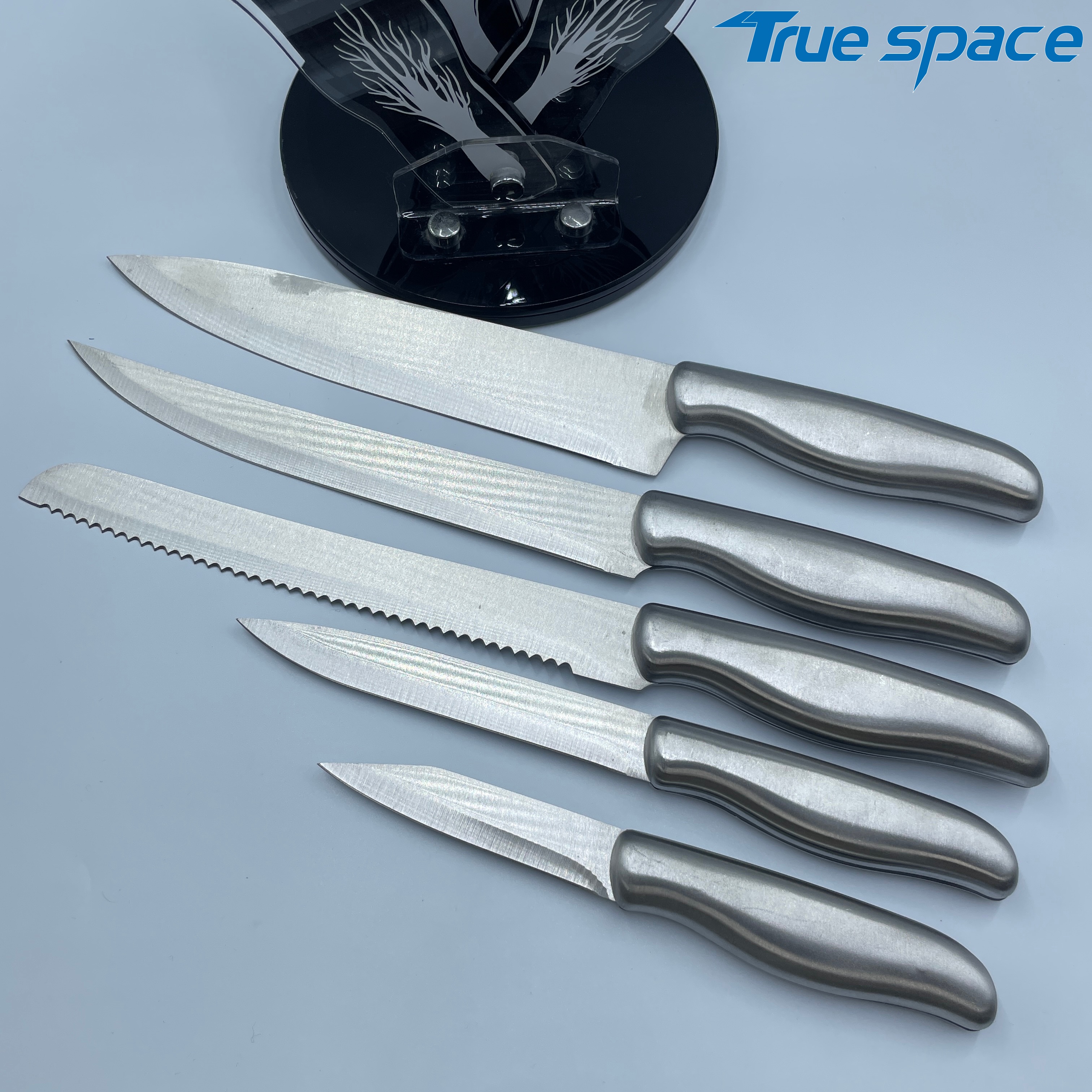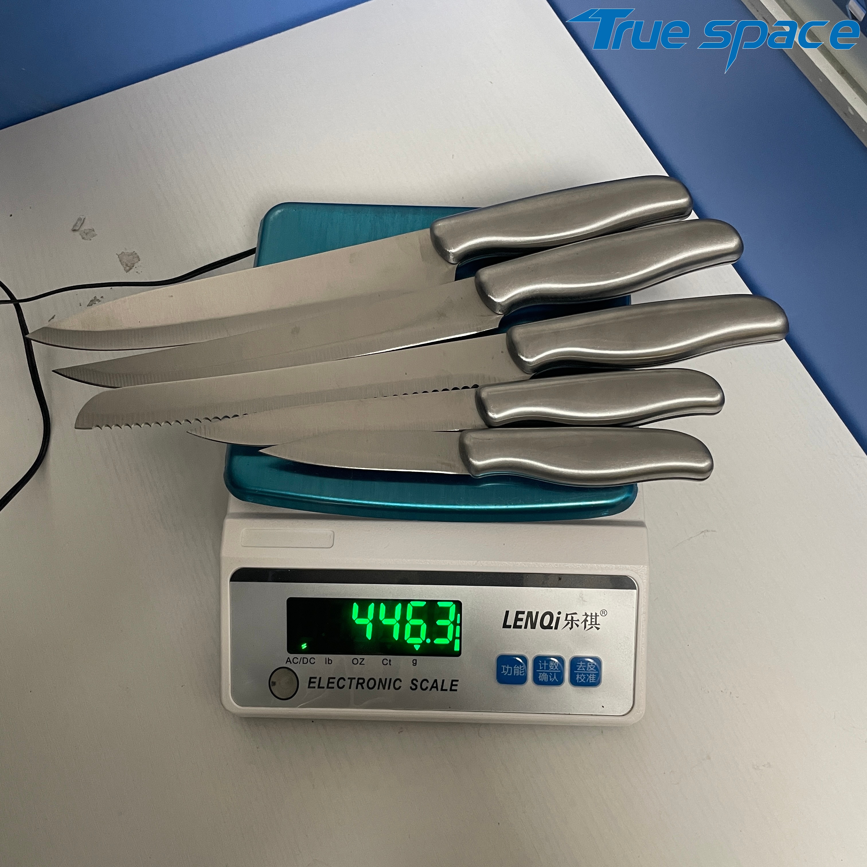 MeasurementFruit knife :19.5*1.8cmMulti-functional knife :23.2*1.8cmSerrated knife :31.7*2.3cmSlicing knife :31.9*2.4cmChef’s knife :31.7*3.5cmMaterialBlade:Stainless steelHandle:Stainless steelWeight446.3gOptions/